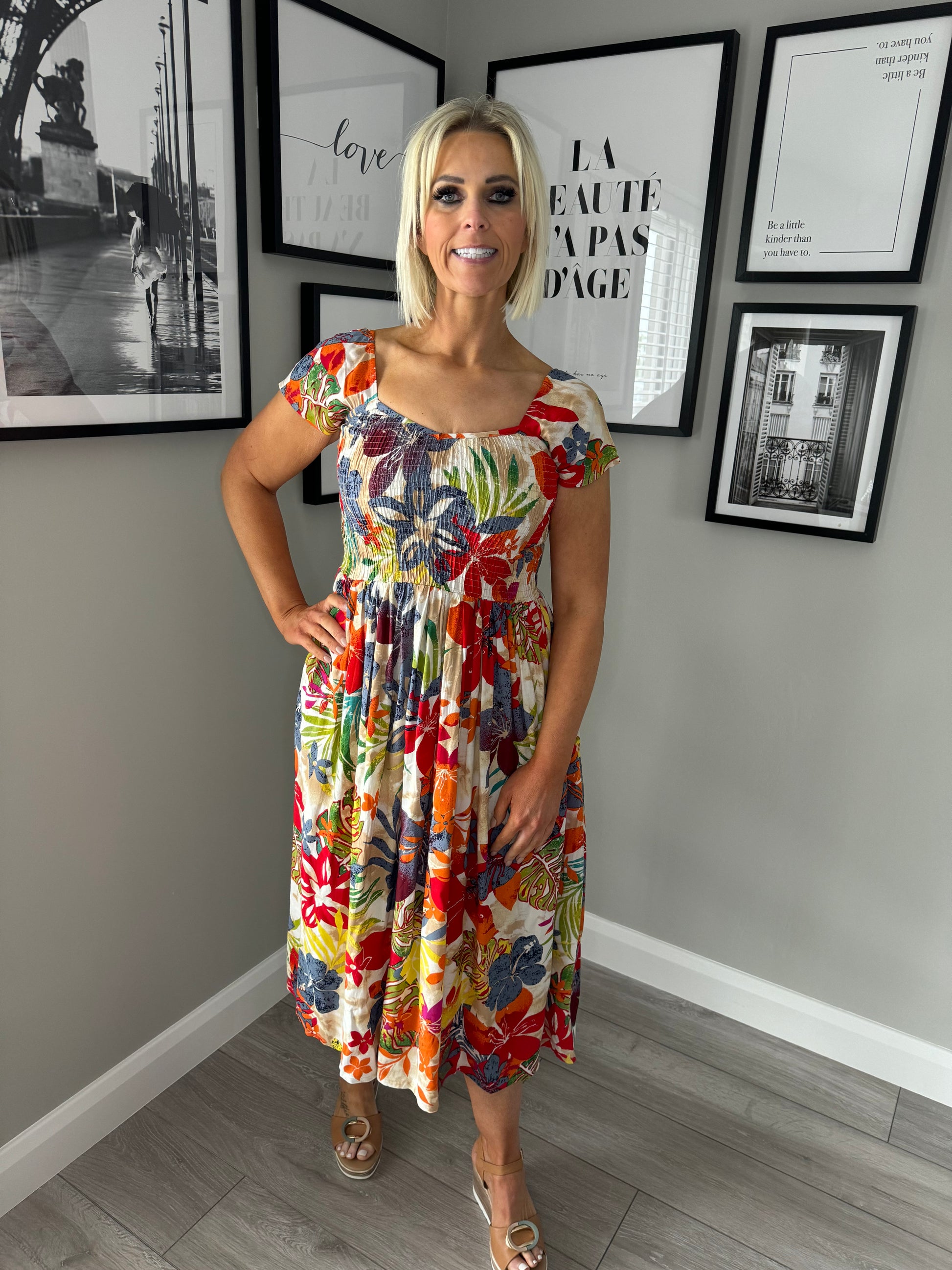 Claudia C midaxi (calf length) style dress with elasticated bodice & waistline for ultimate shape & finished with a cap sleeve. Abstract floral multi coloured print.