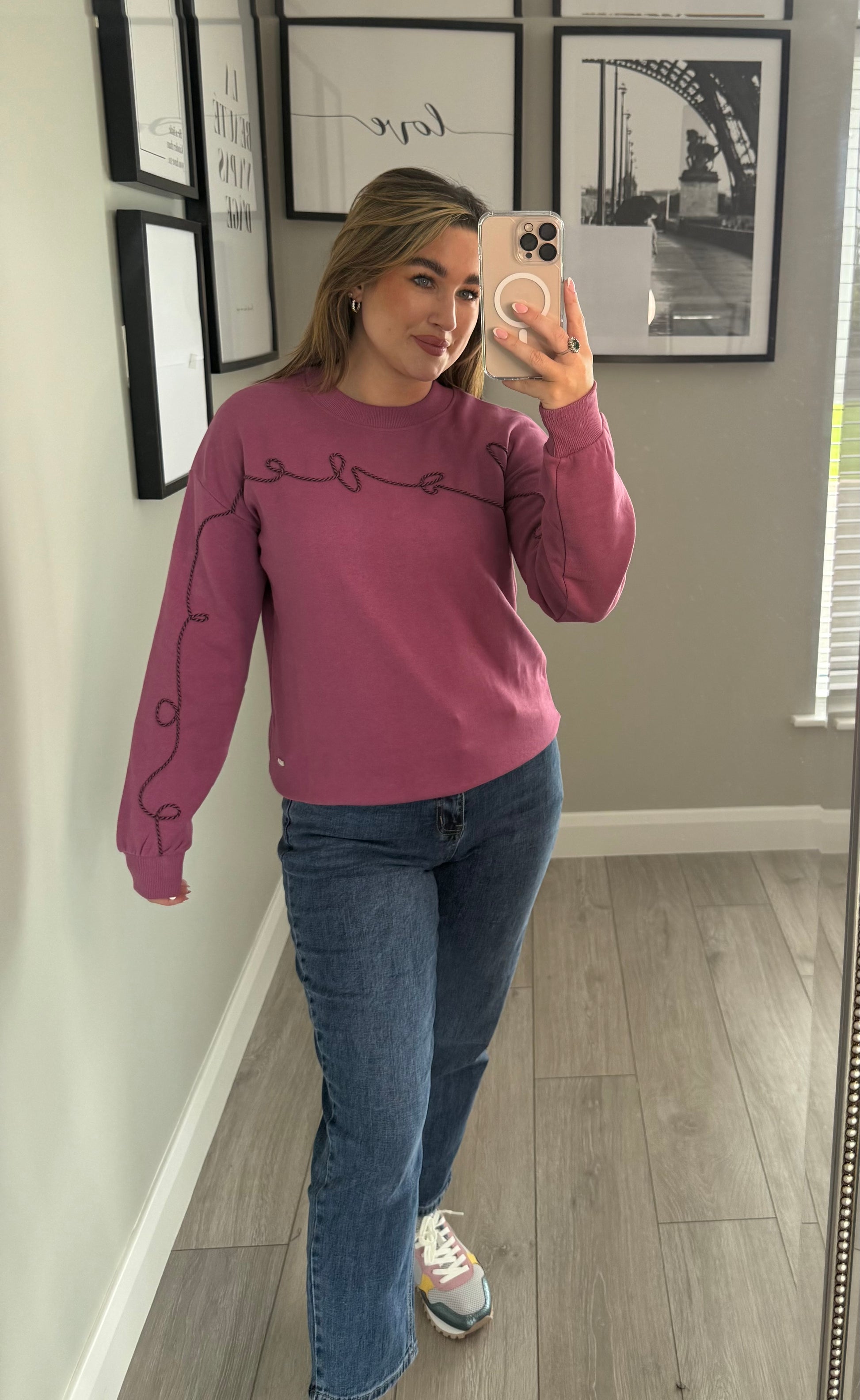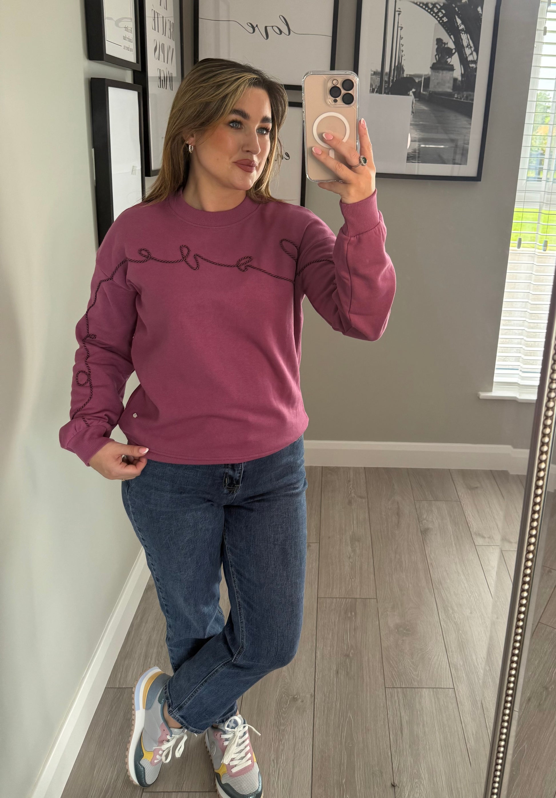 -Relax & Renew round neck sweater in berry pink with deeper stitch effect slogan. Cuffed arms & hemline.