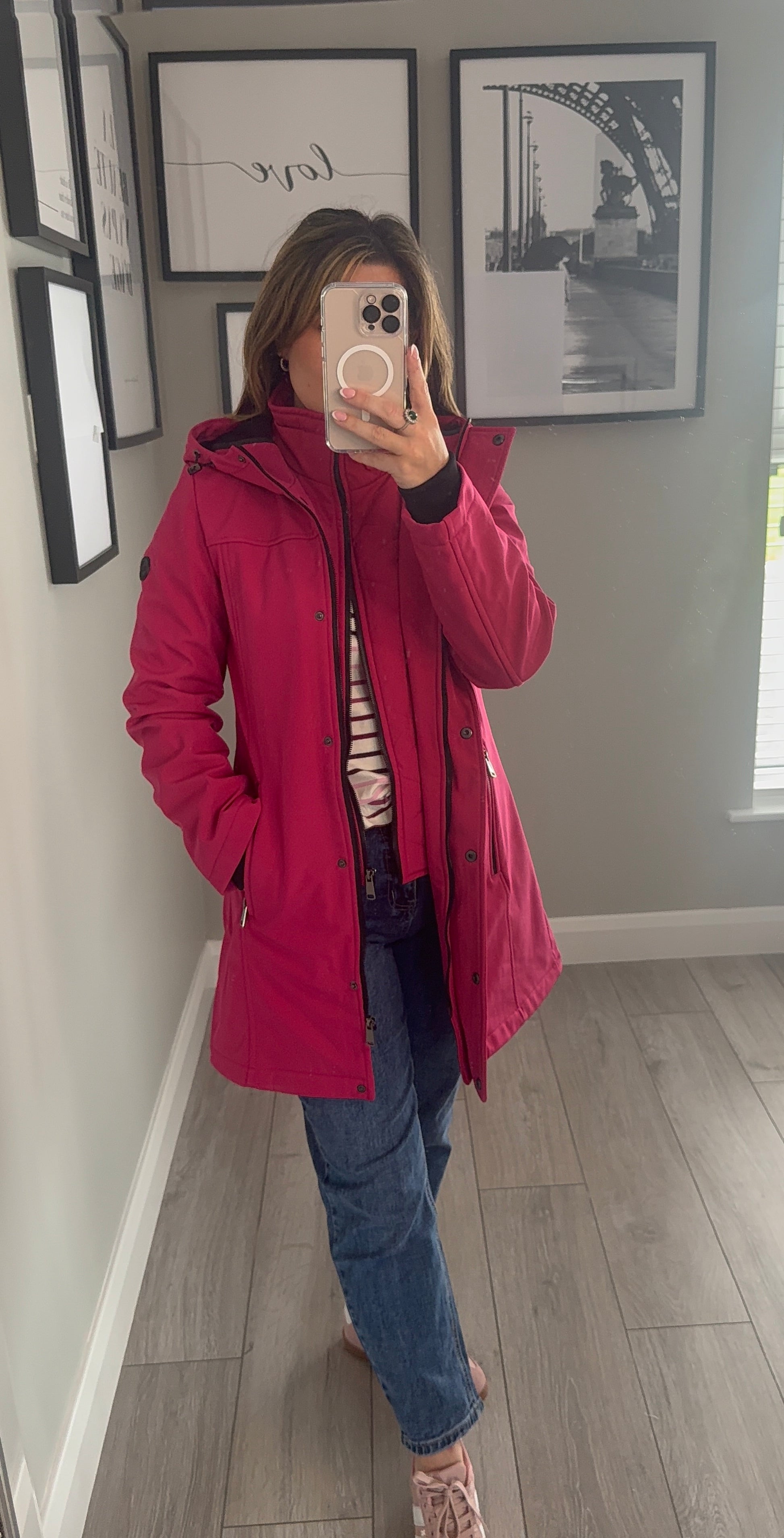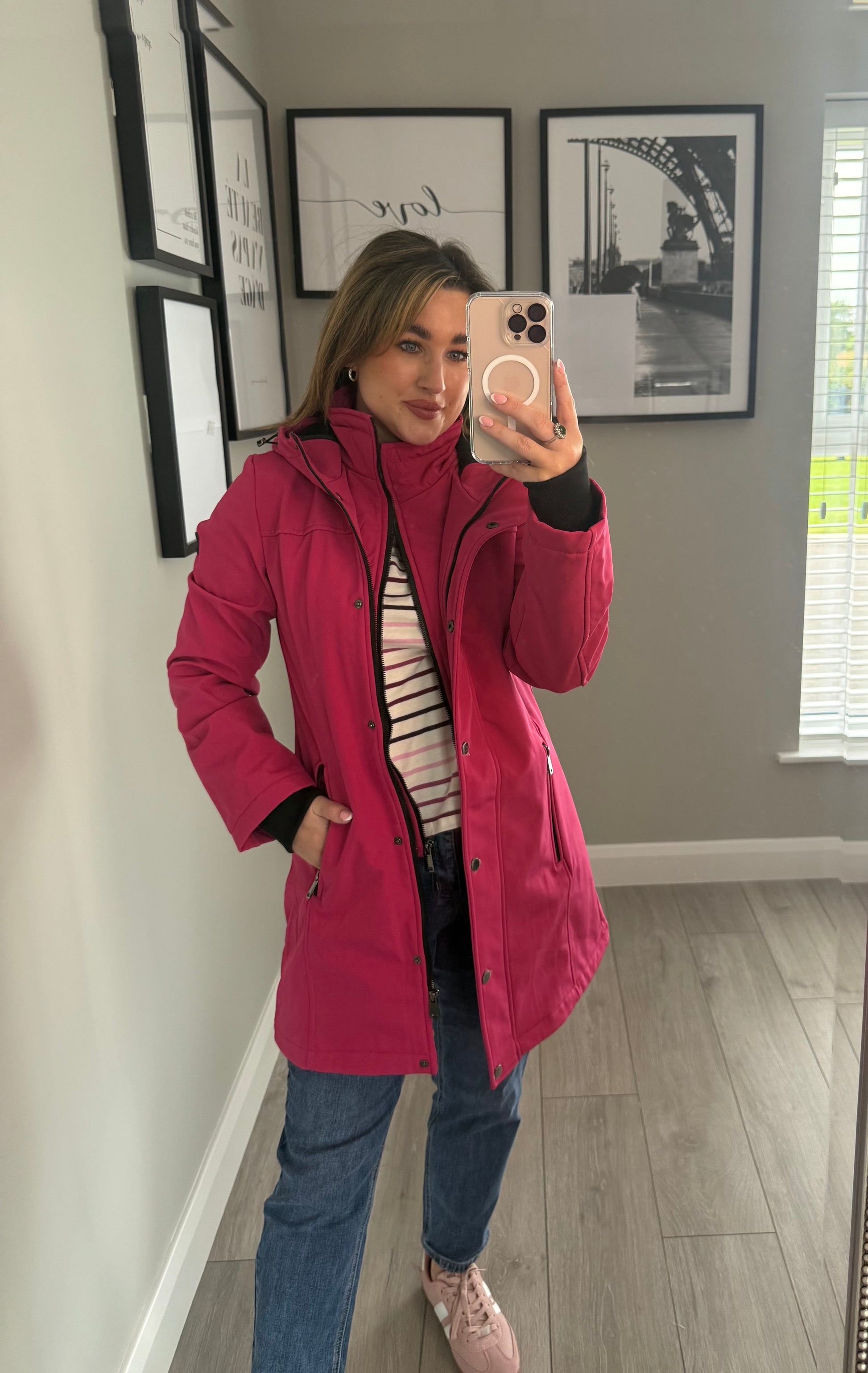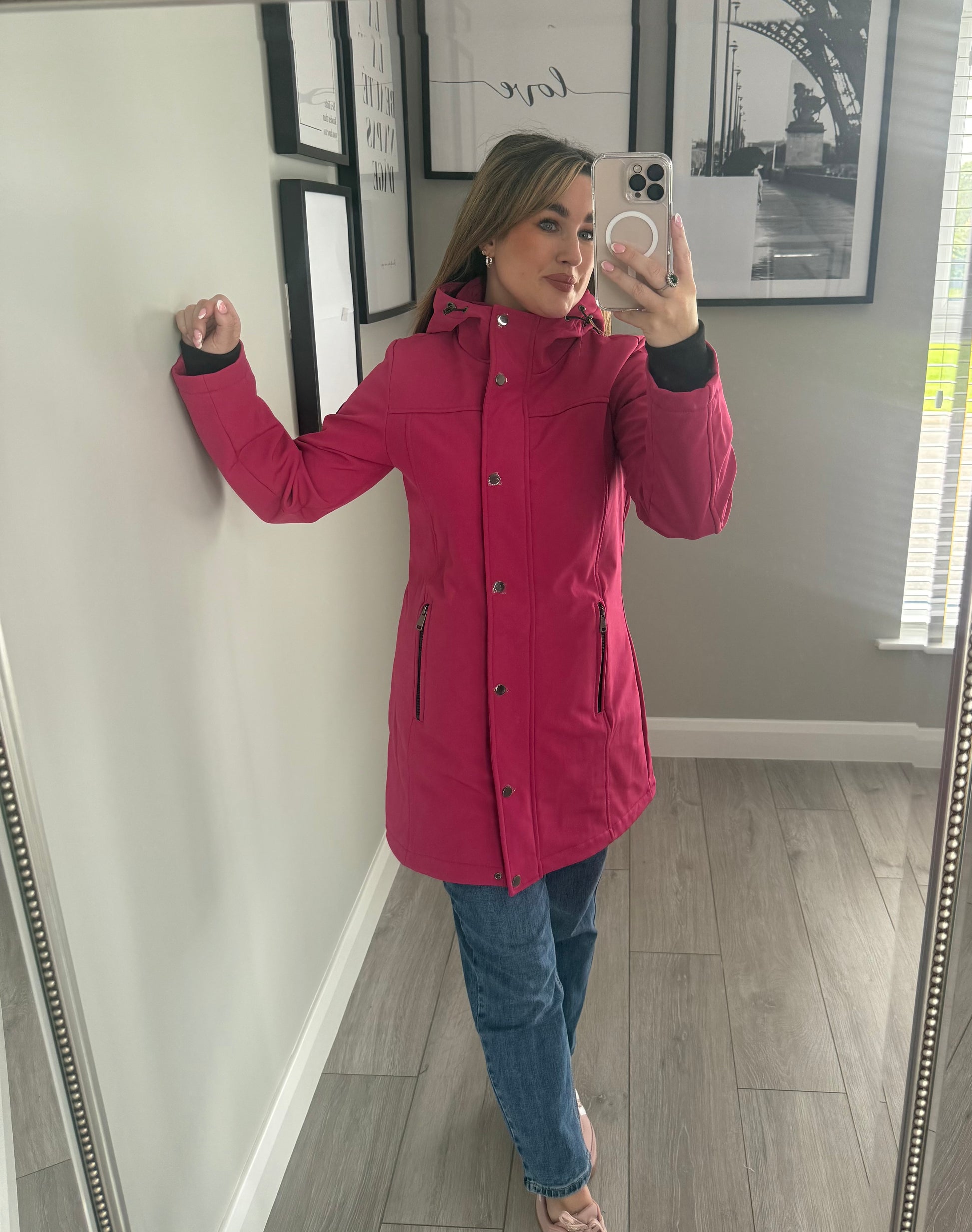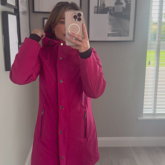 -Relax & Renew soft shell water repellent coat in cerise pink. Fully lined with short padded jacket effect to the bodice & cuff sleeves. Finished with generous hood.