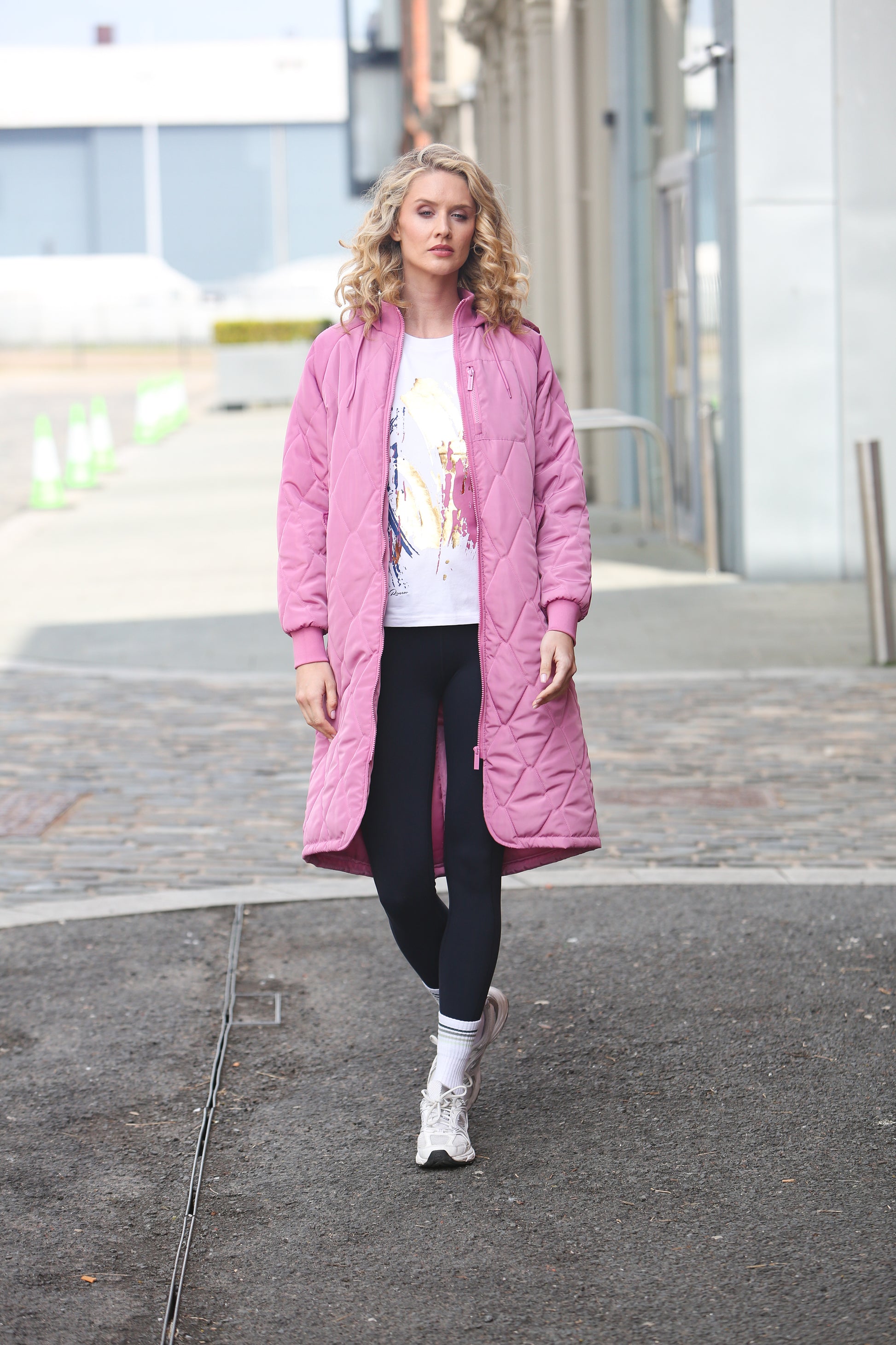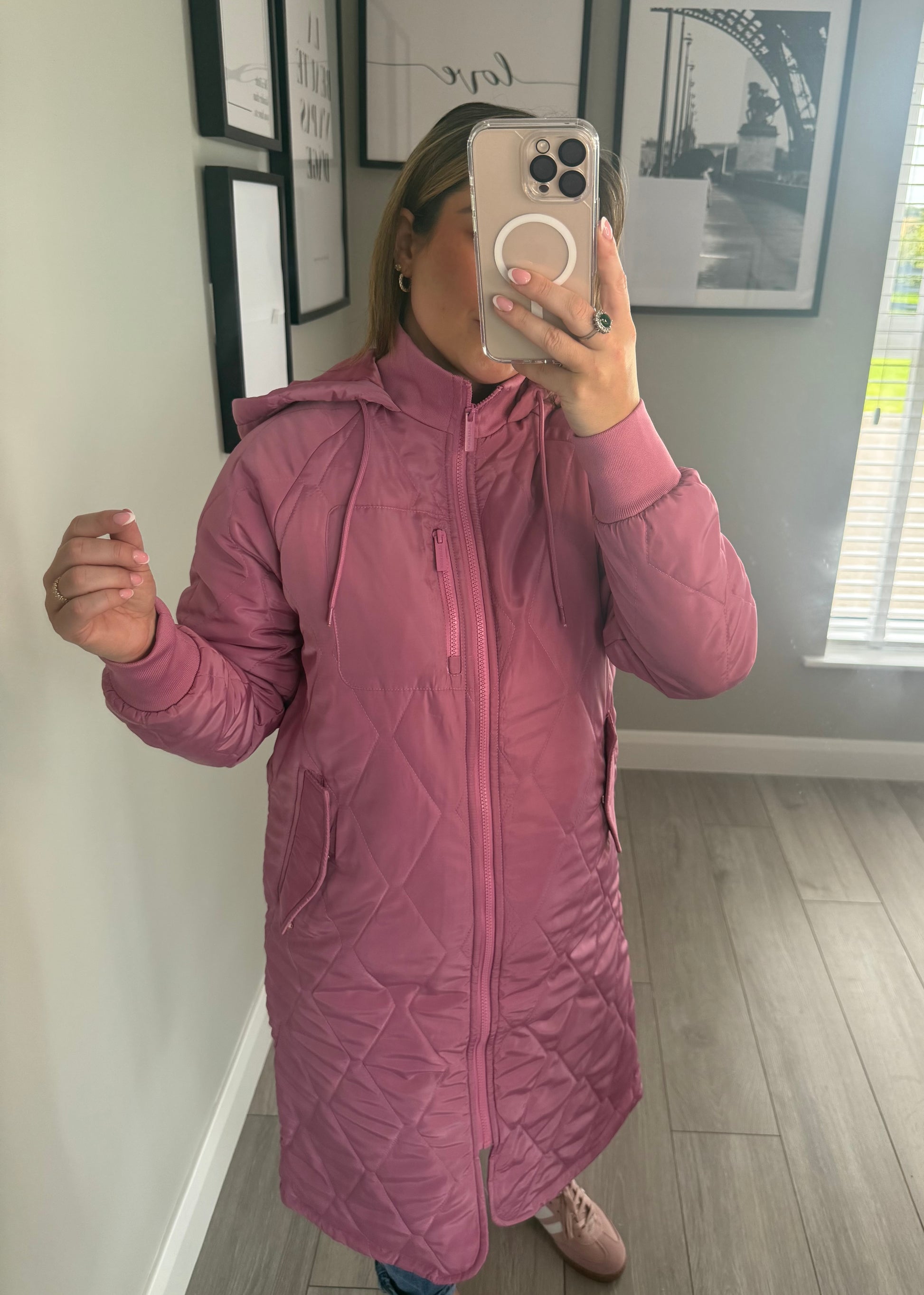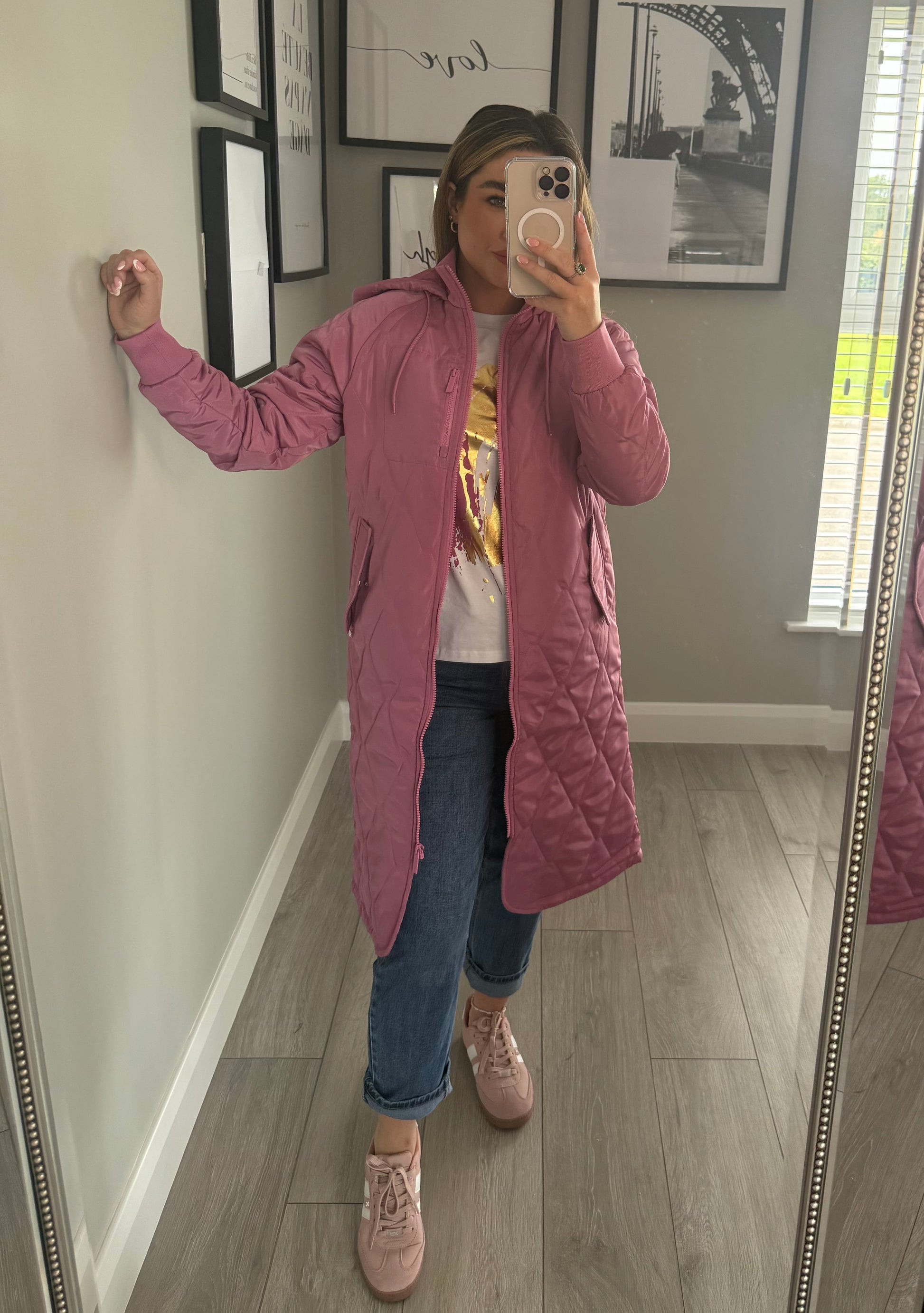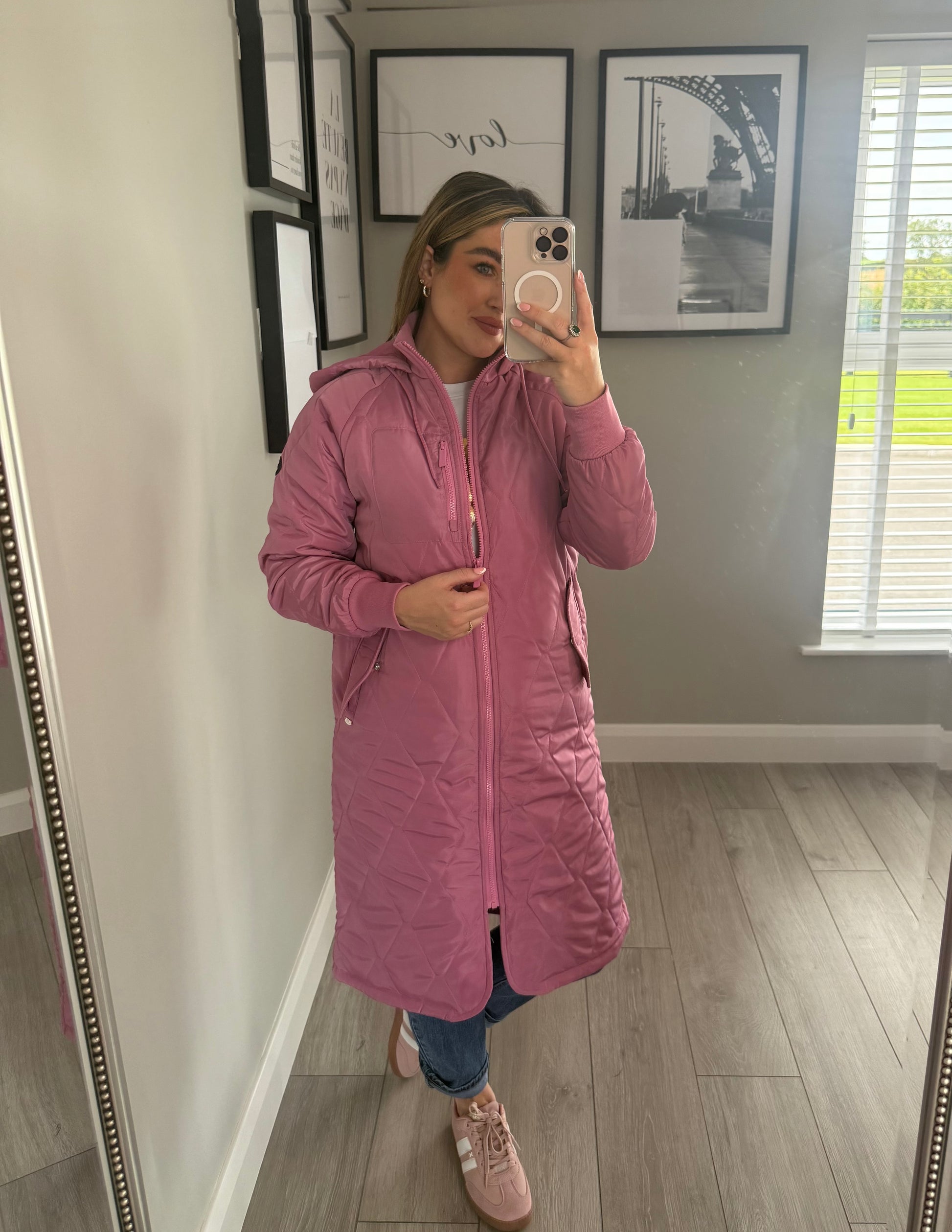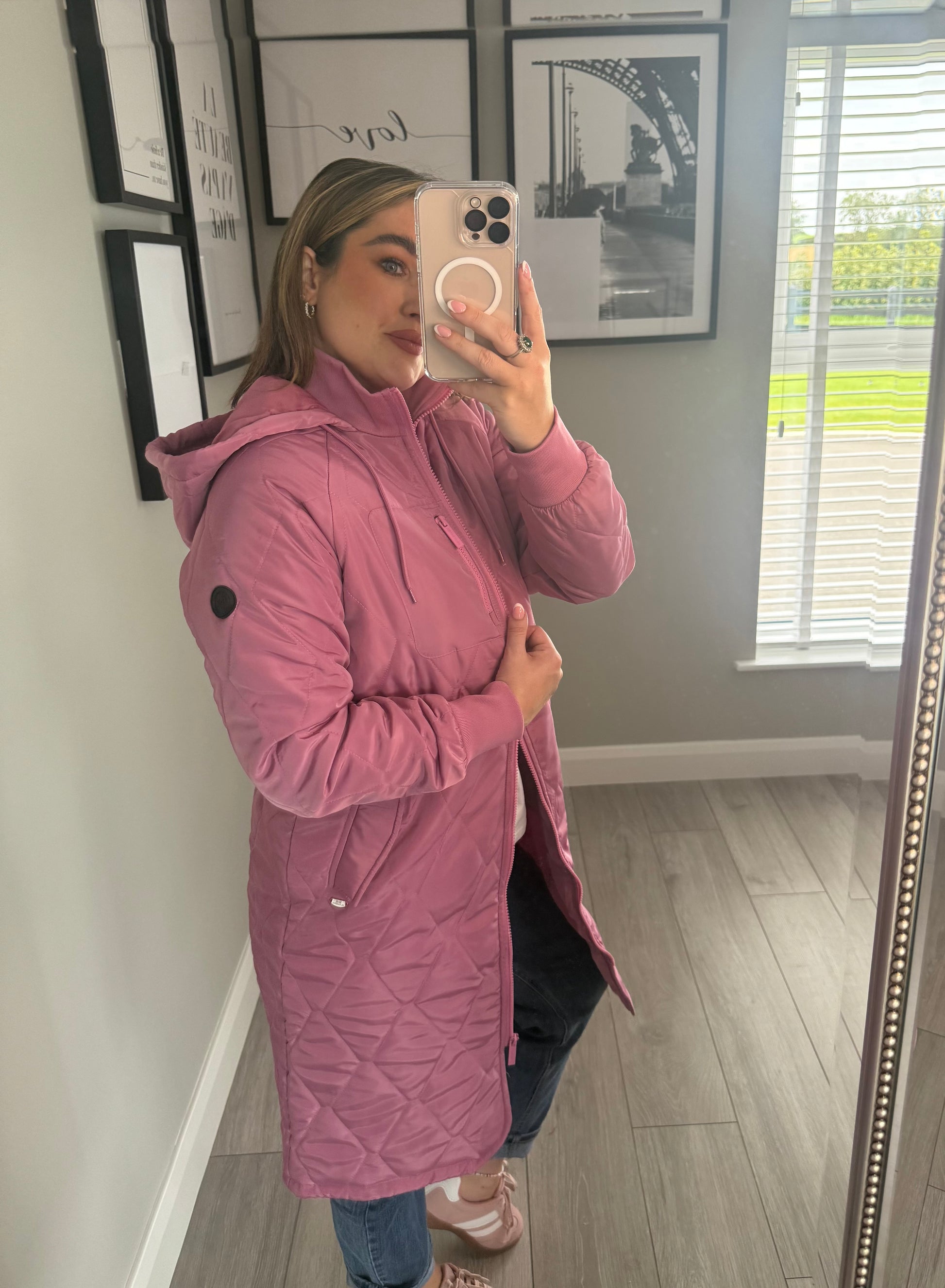 -Relax & Renew lightly padded longline coat in berry pink. Double closure pockets with zip through & generous hood. Finished with dipped hem.