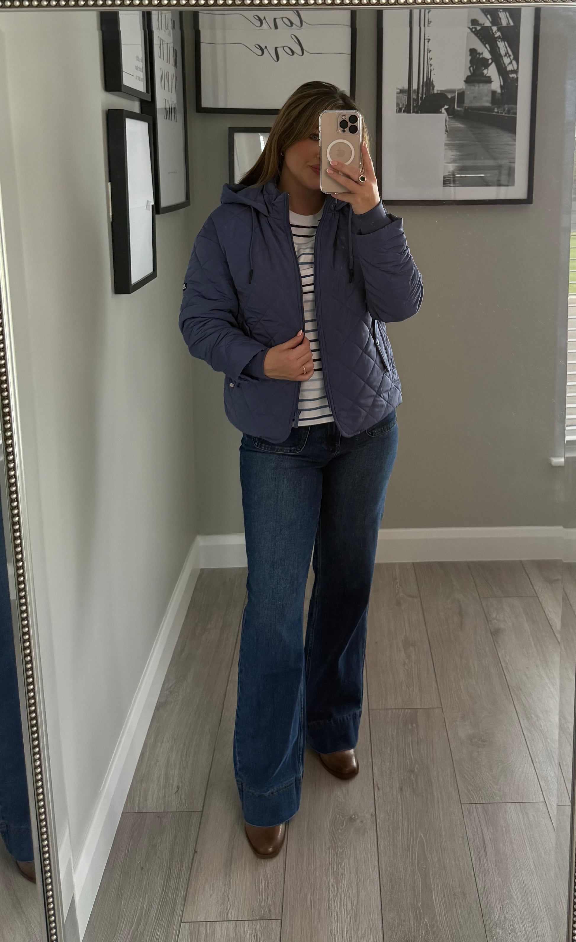 -Relax & Renew lightly padded jacket in ink blue. Double closure pockets with zip through & generous hood.