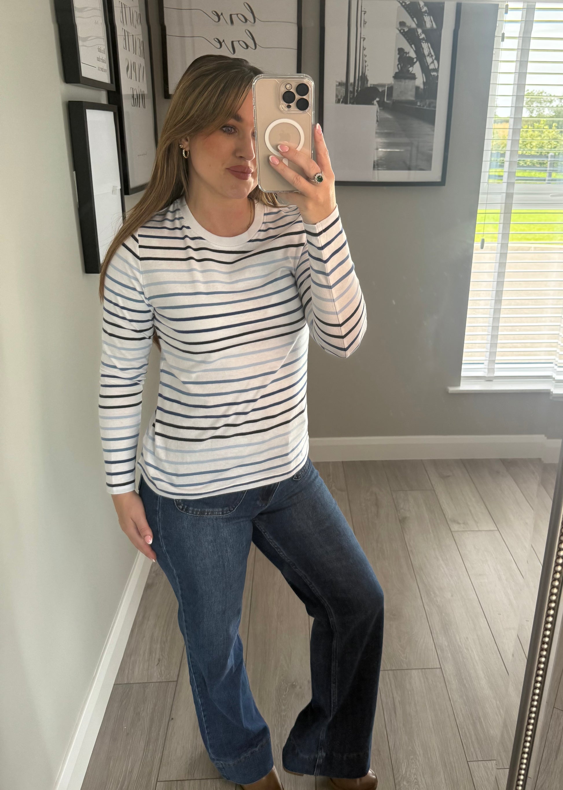 -Relax & Renew long sleeve tee in multi coloured stripe design (blue). Round neckline & branding to the hemline.