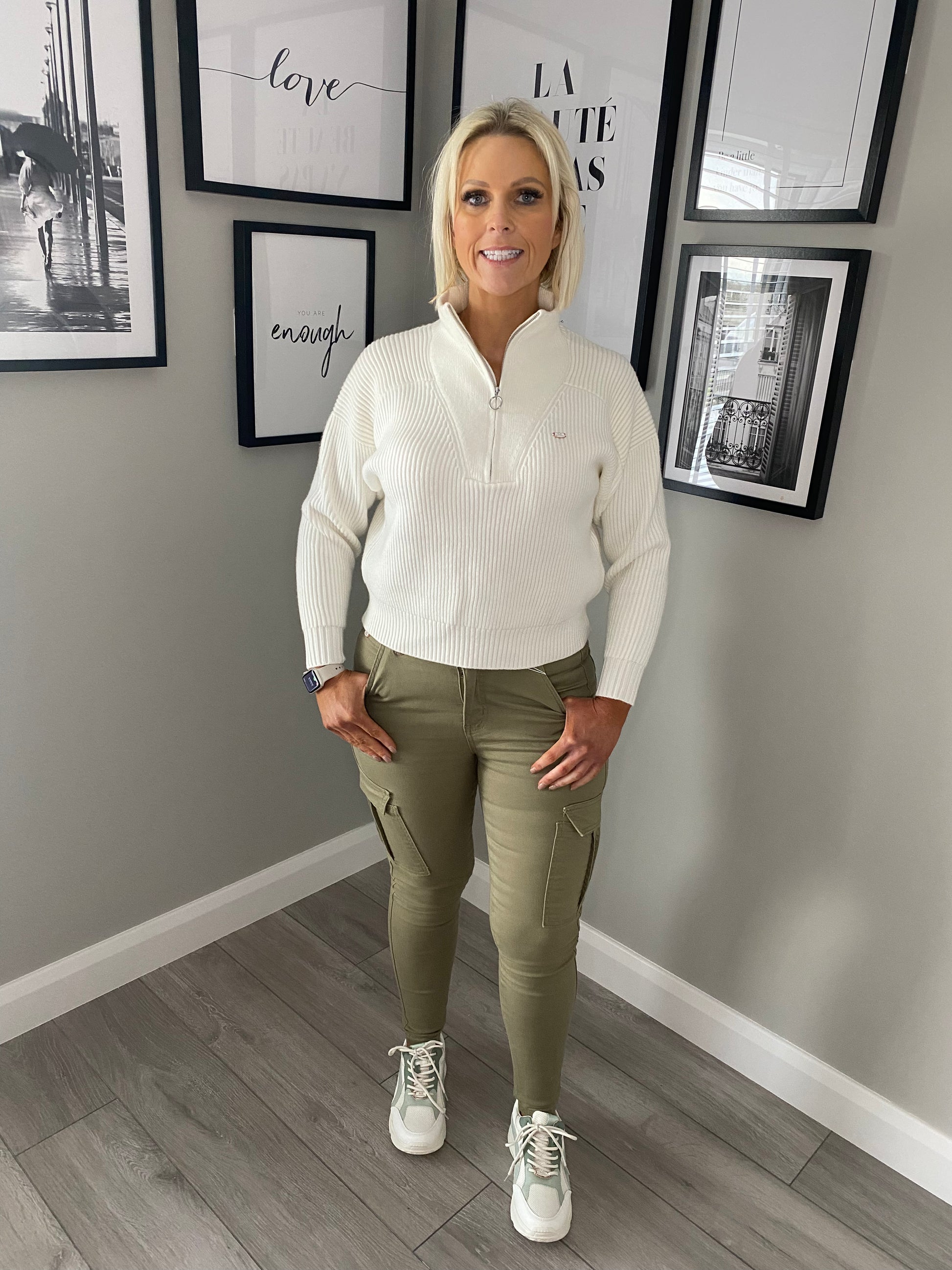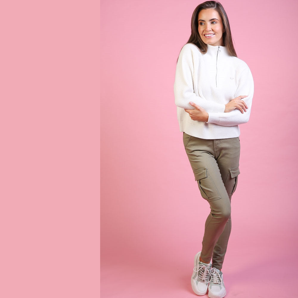 From the Relax & Renew range the Lily combat trousers are right on trend! In a skinny fit it's bringing a modern twist to a classic combat. With zip fastening and two side pockets, as well as the additional leg pockets these will sit with so much in your wardrobe this Summer! Available in this soft olive green or cream & in two leg lengths (short 28 inch, regular 30 inch)
