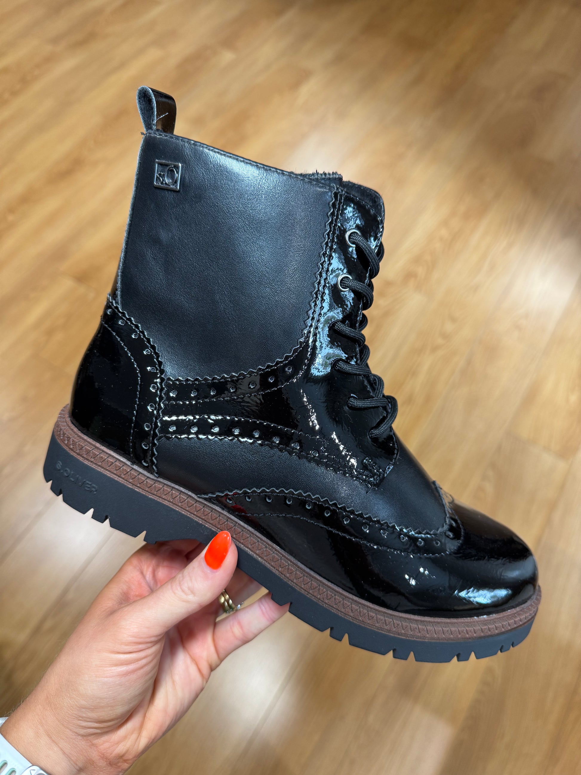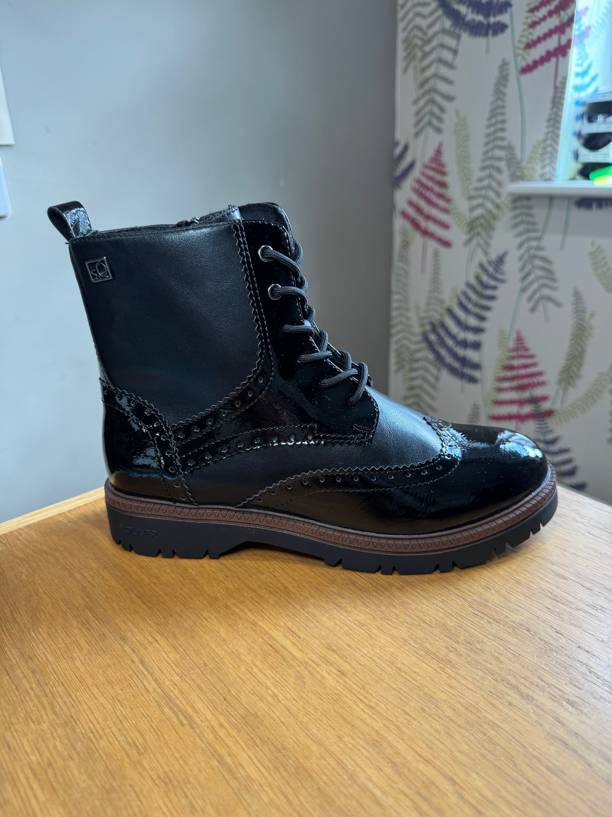 S. Oliver Flat Lace Up Boot with Patent Brogue Effect Detail (with Inside Zip Opening)