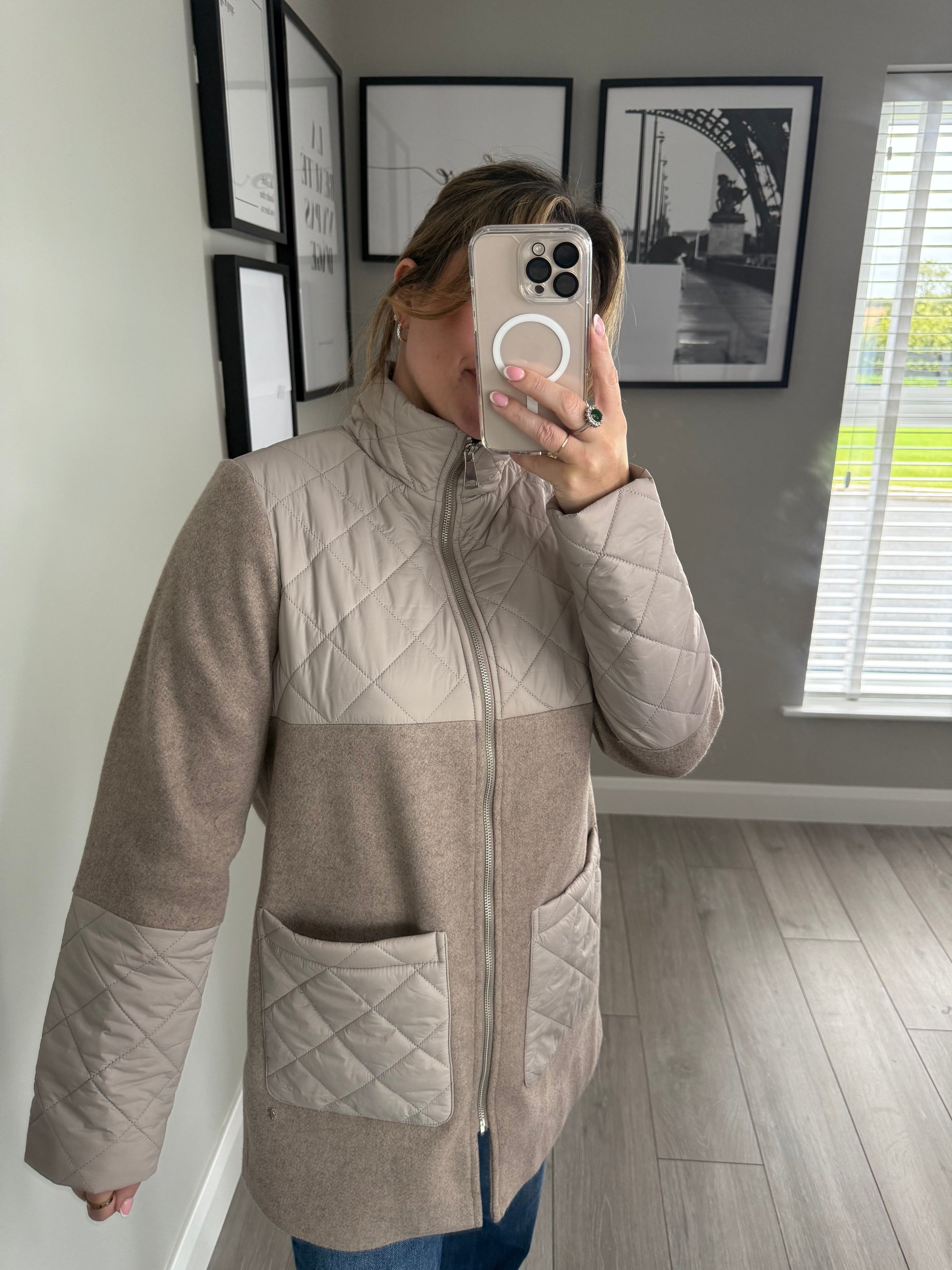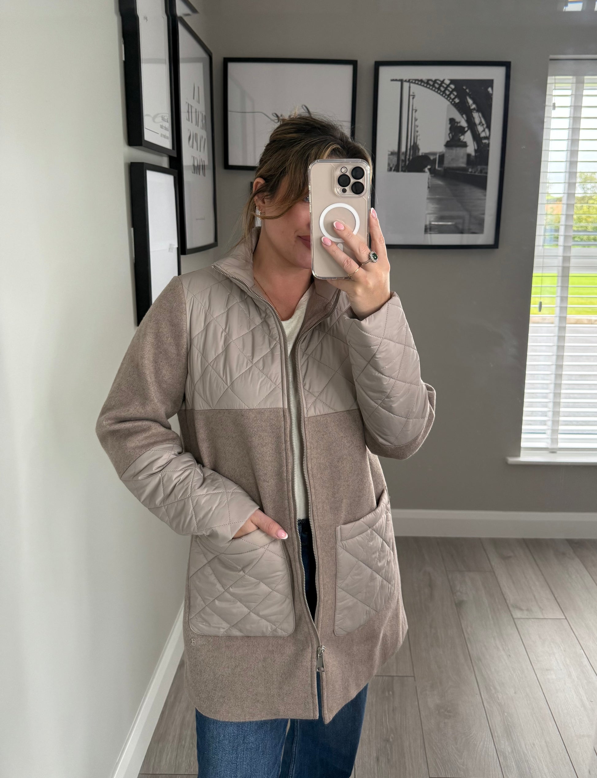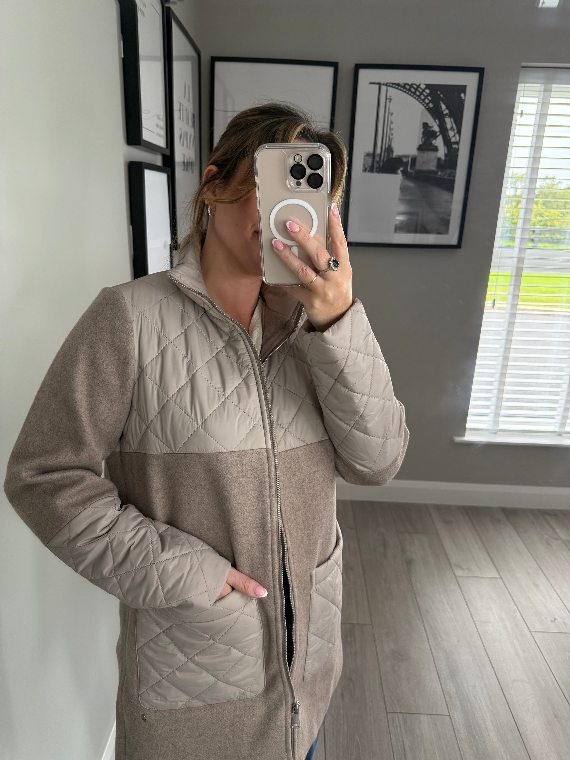 -Jessica Graaf two toned half quilt effect coat, zip through on silver hardware with large quilt design pockets.