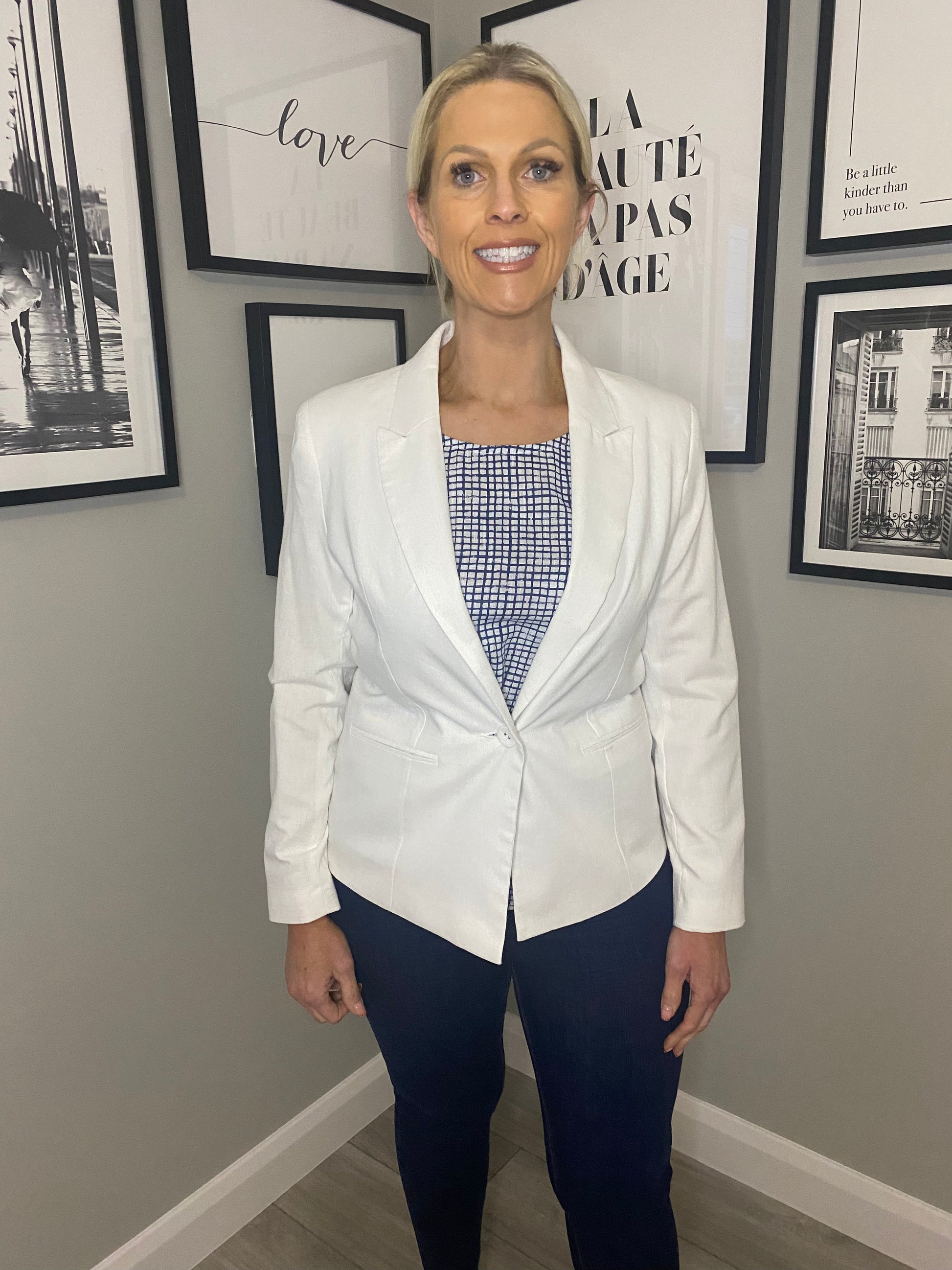 Classic light linen blazer in crystal white. Full length sleeves & lightly padded shoulders for shape. Single button fastening. True to size.