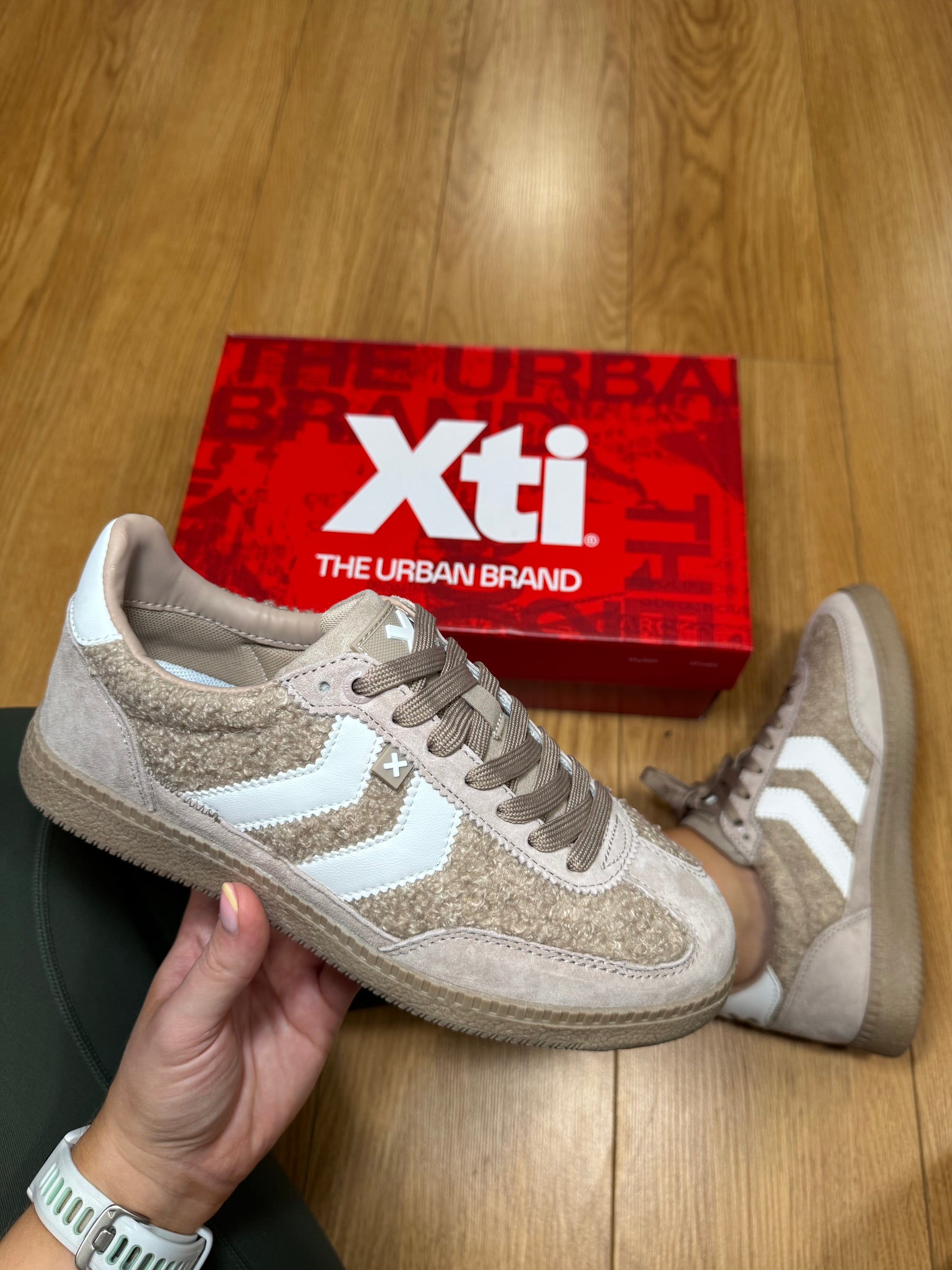 XTI Lace Up Stripe Trainer in Boucle Teddy Design & Gum Sole