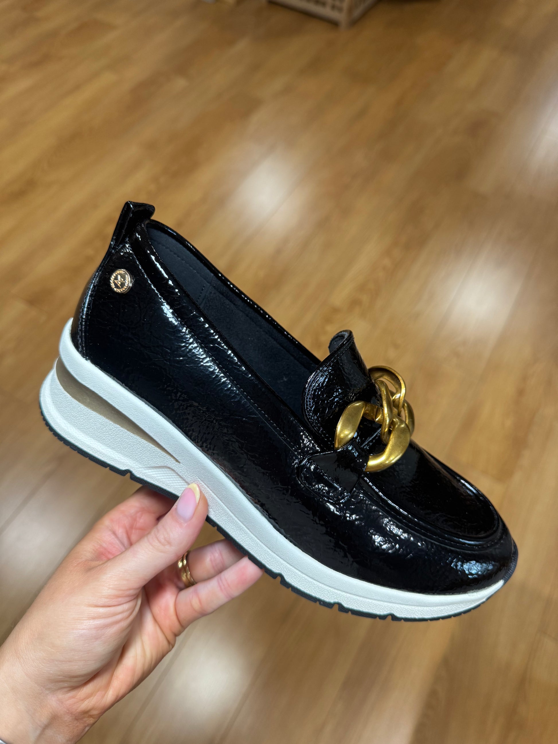 XTI Slip On Loafer with Small Wedge, Patent Finish & Large Gold Chain Detail