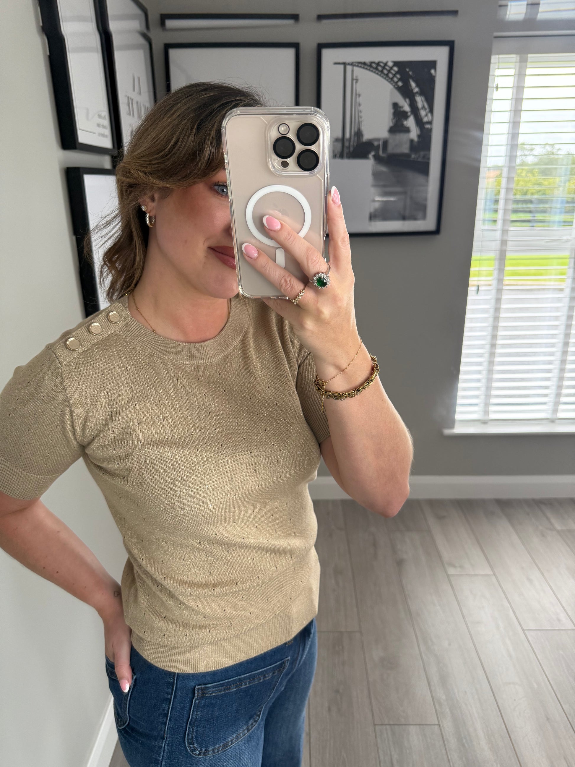 -Yest sand/beige short sleeved fine knit jumper with shimmer perforated design & gold button detailing to the left shoulder.
