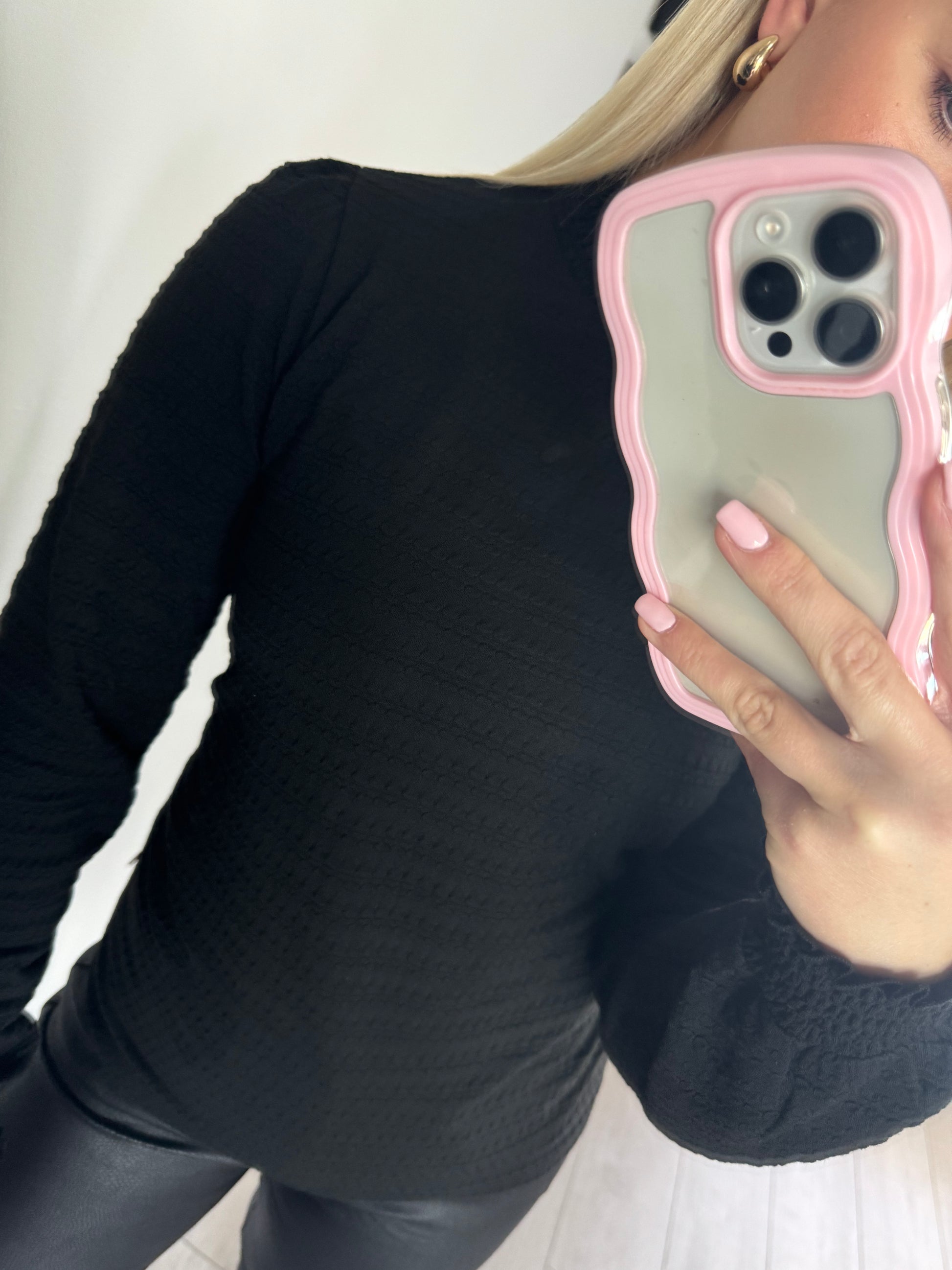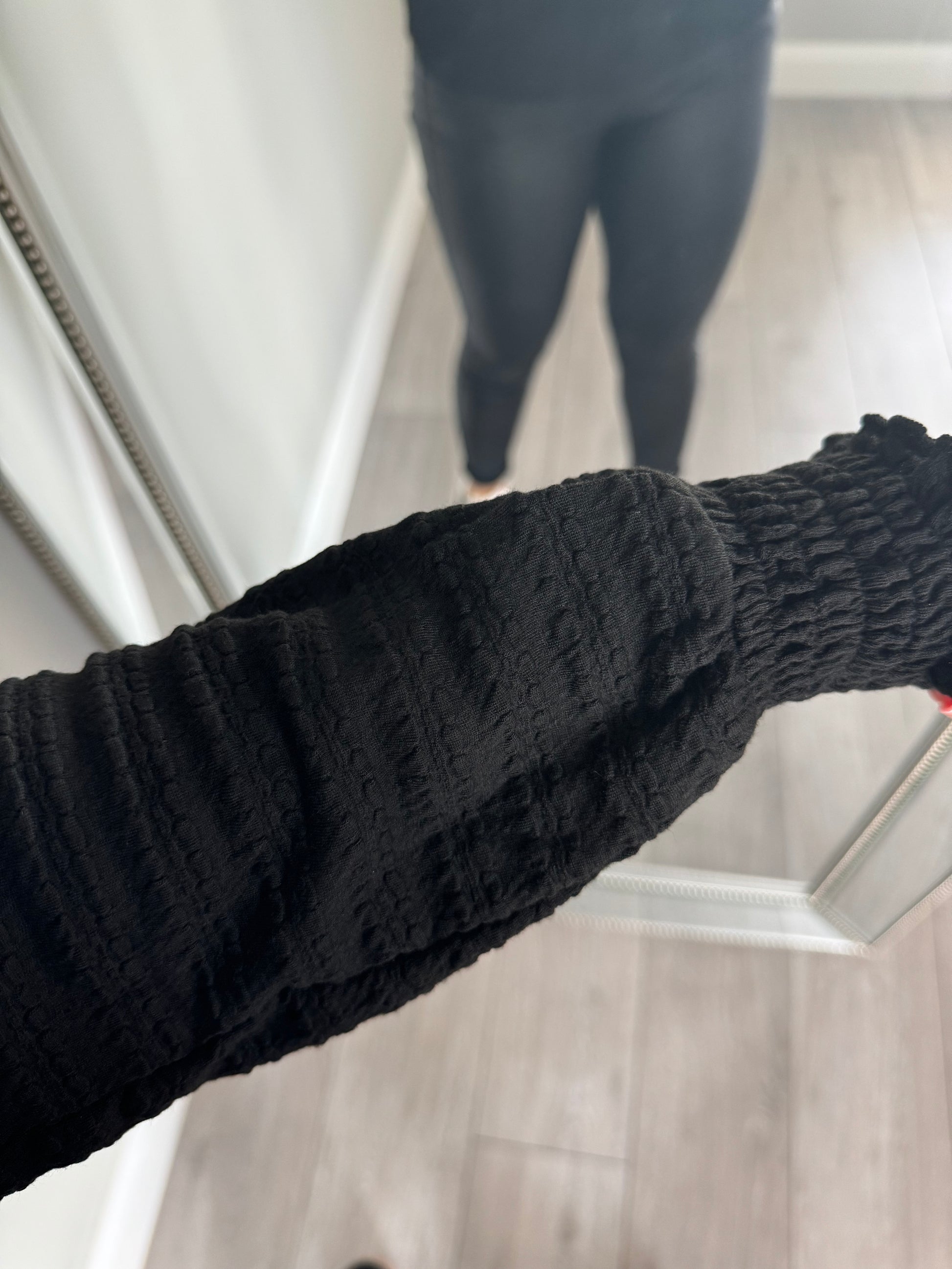 -Yest black top with subtle self print, elasticated cuff sleeves & elasticated high frill neckline (turtle neck style).
