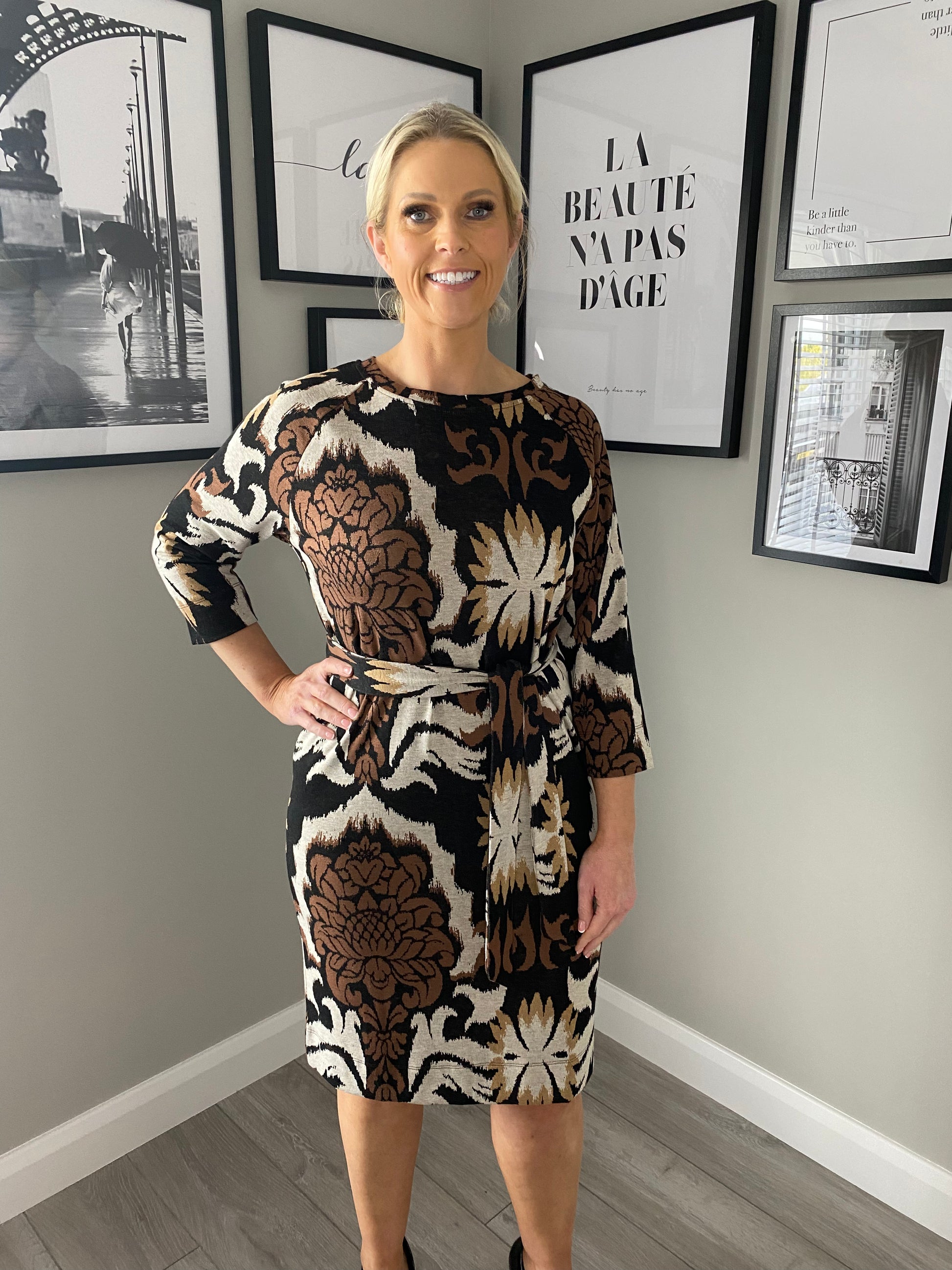 From the Yest range we've got cosy & smart in this brown/black/sand printed dress. With three quarter length sleeves & high round neckline it's in a fine knit jersey mix providing that little bit of warmth this Winter. Finished with matching belt to shape. Style with or without tights & boots. Matching sand longline cardigan also available for an additional layer.
