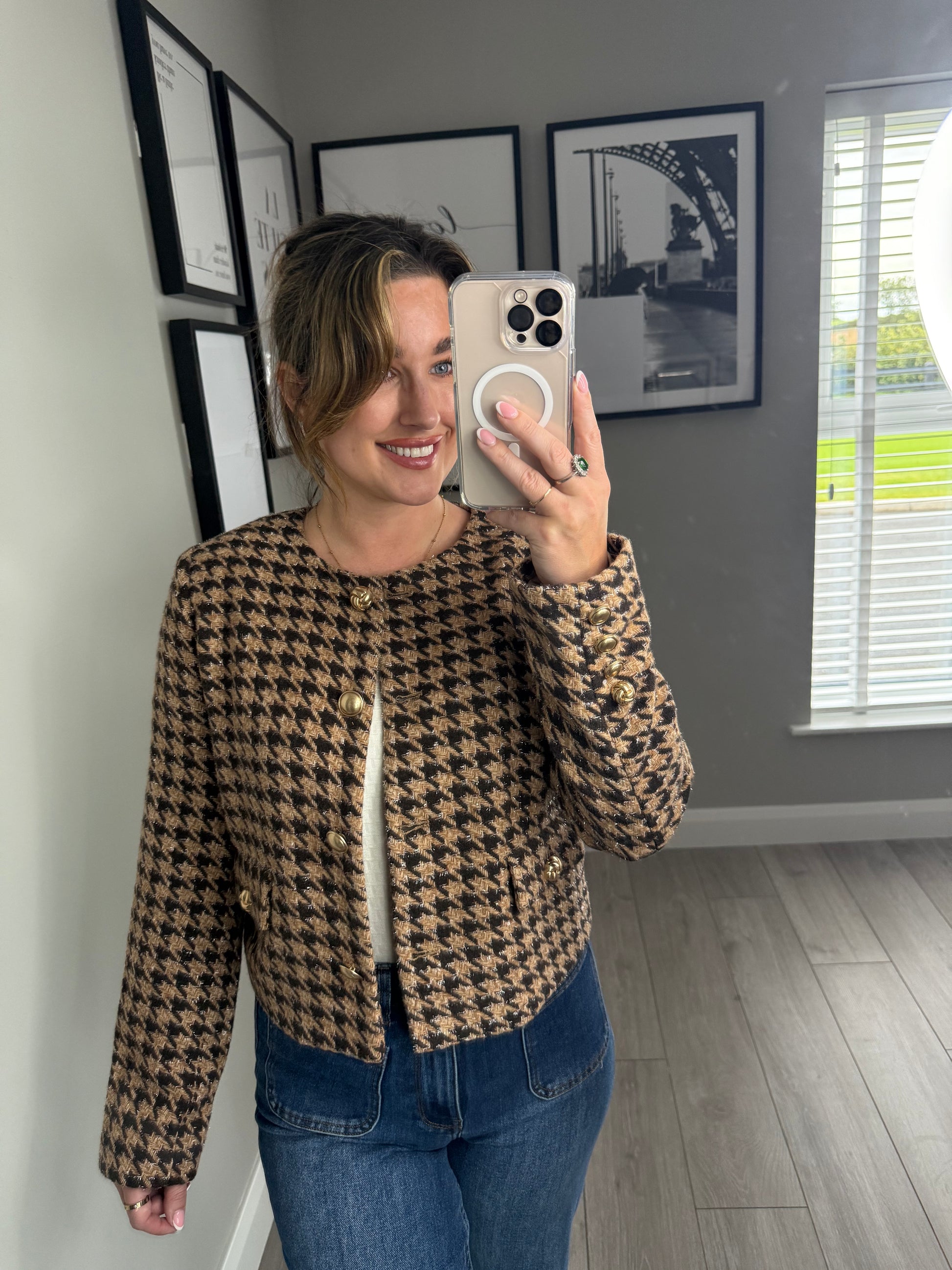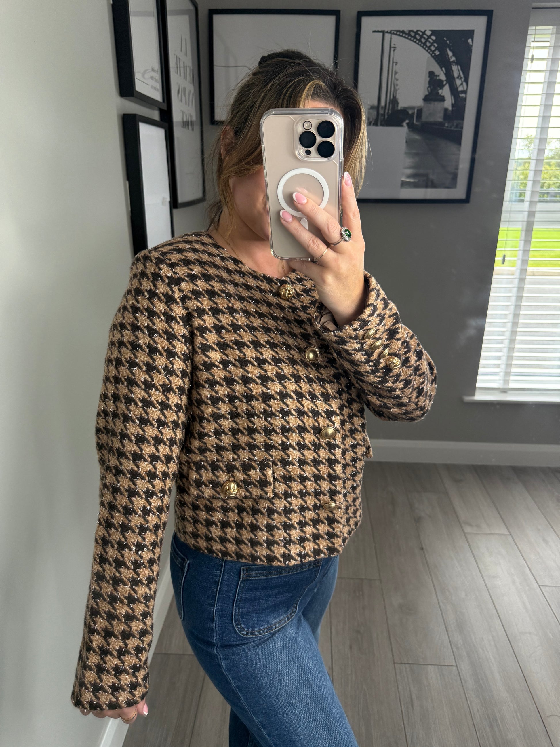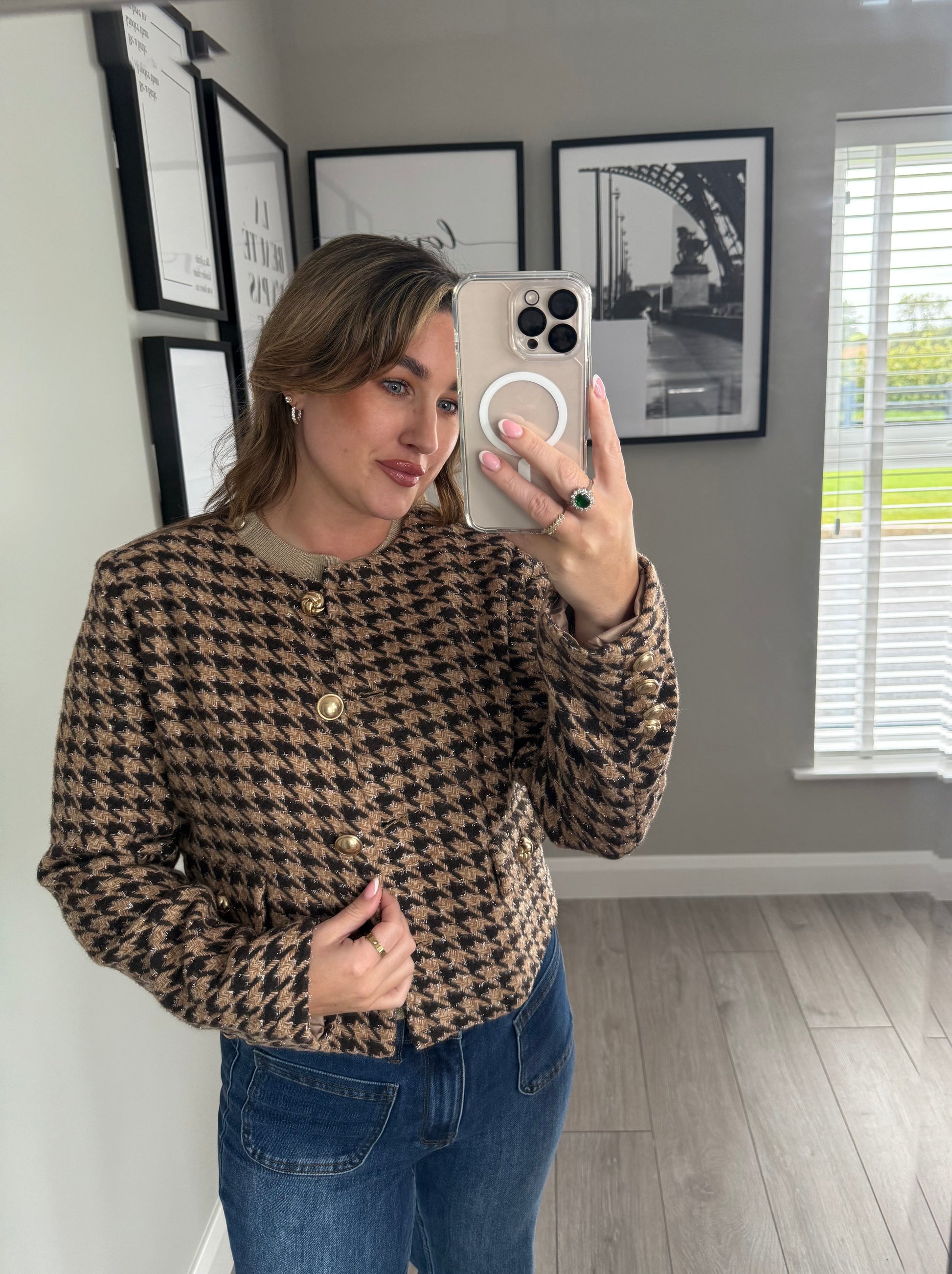-Yest cashew beige & brown houndstooth printed jacket. Collarless fitted style with striking gold buttons.