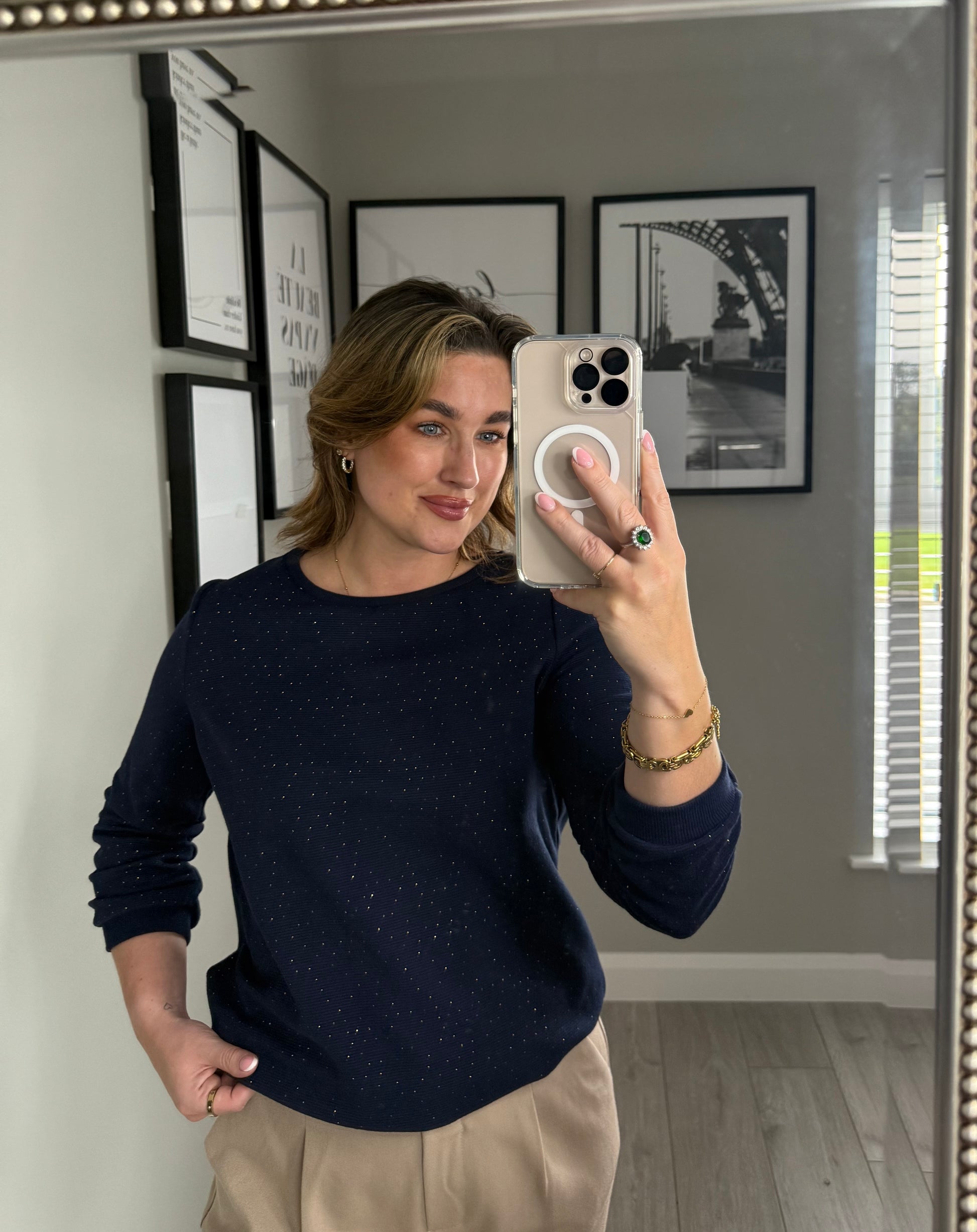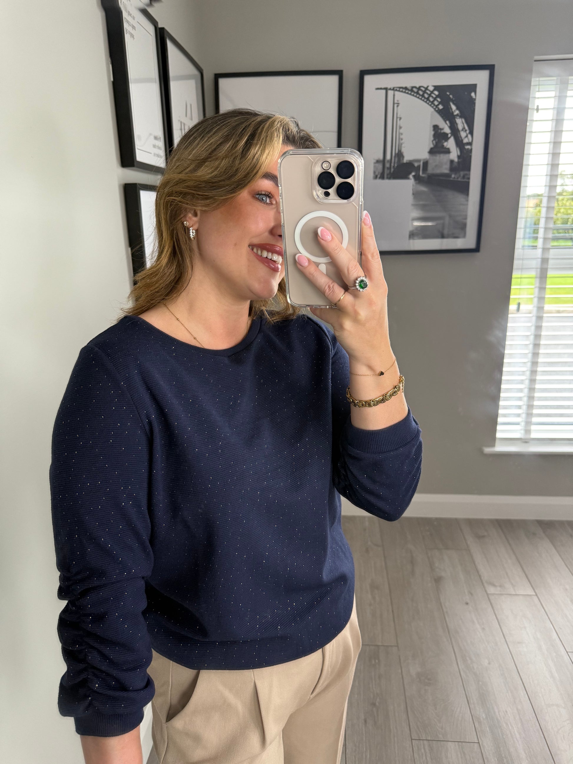 -Yest navy & gold shimmer round neck sweater/jumper. Ruched half sleeve detail.