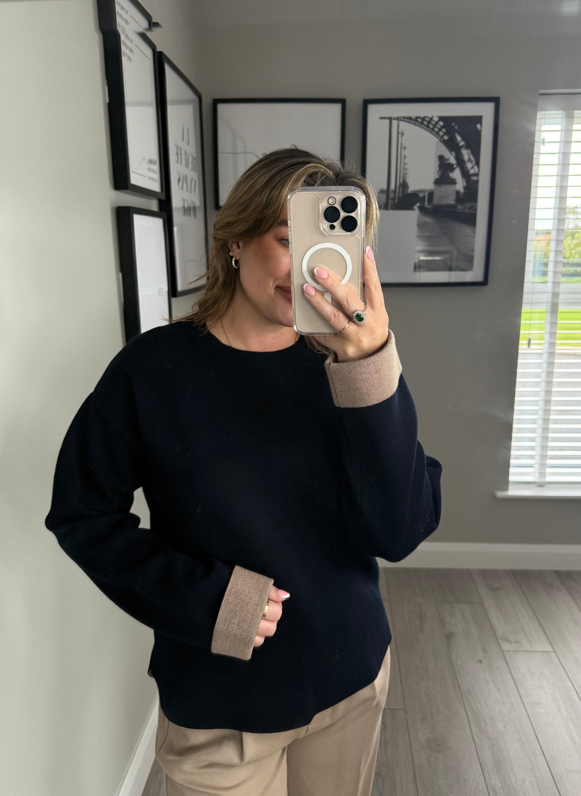 -Yest soft knit round neck jumper with contrasting large tan cuff sleeves.