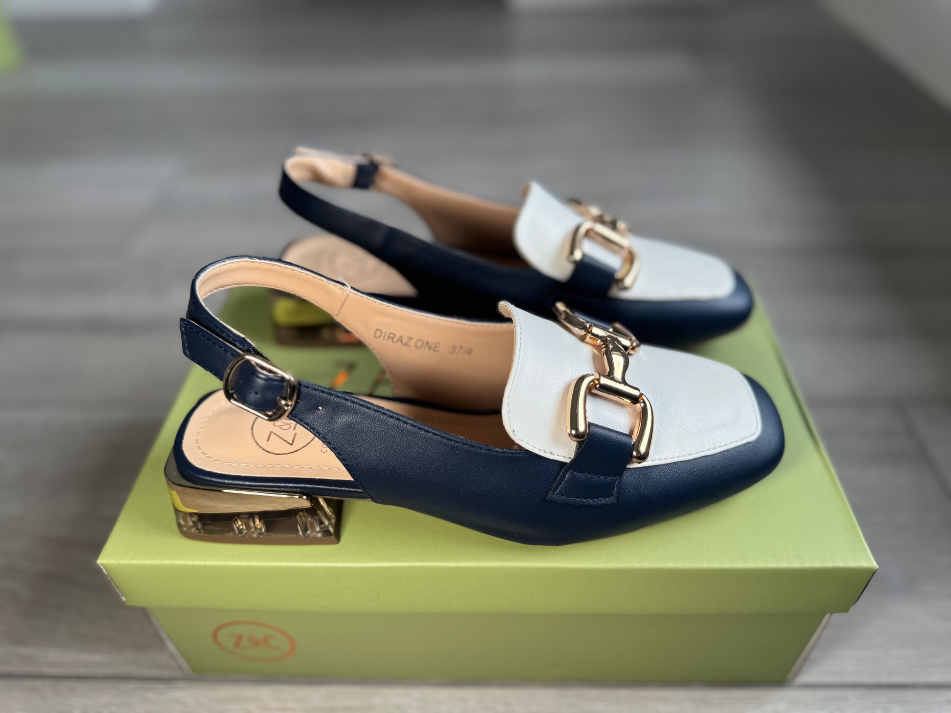 Zanni & Co Slip On Slingback Loafer with Square Toe, Gold Snaffle Buckle & Block Tortoiseshell Heel