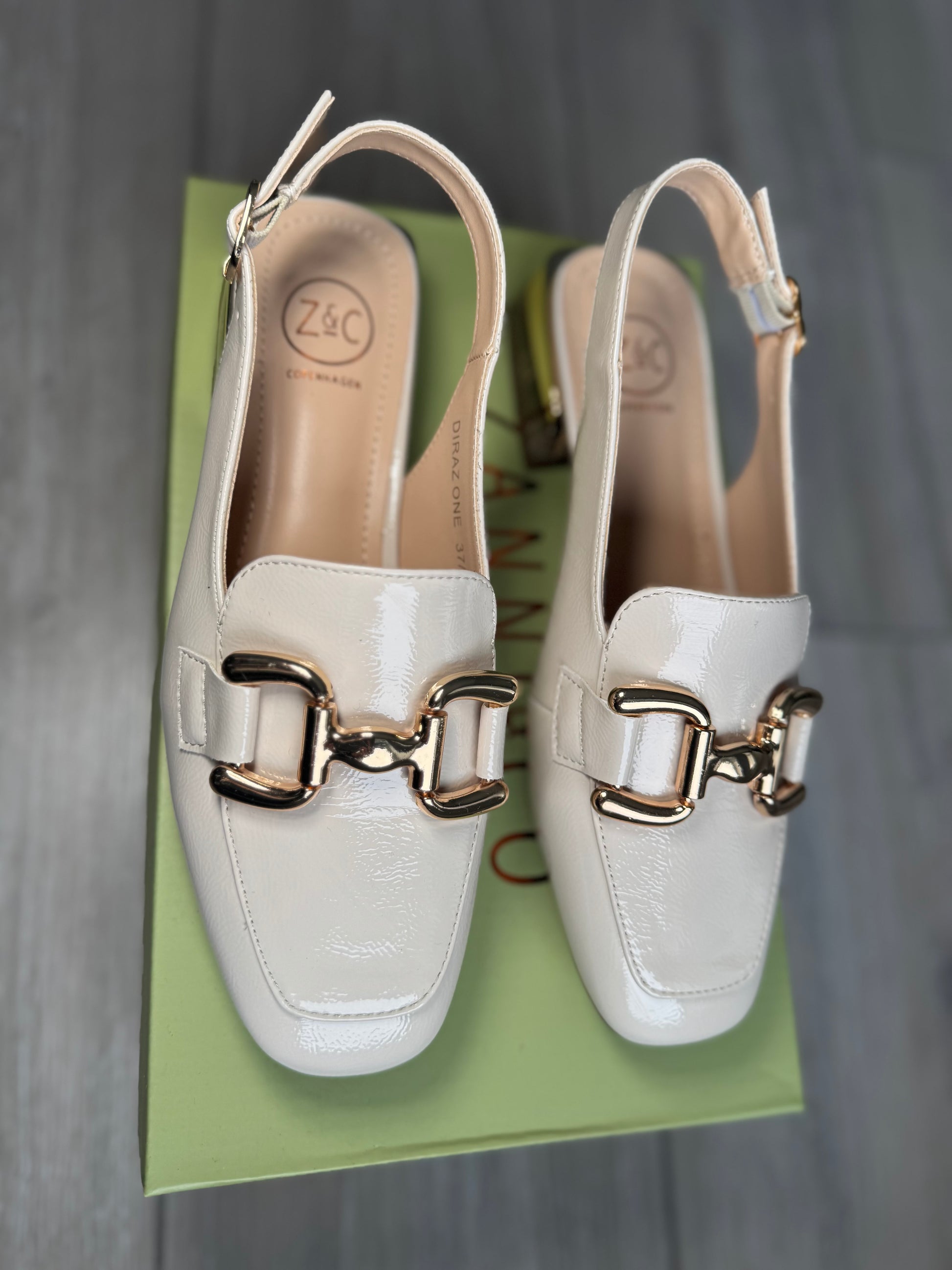Zanni & Co Slip On Slingback Loafer with Square Toe, Gold Snaffle Buckle & Block Tortoiseshell Heel. Patent Finish