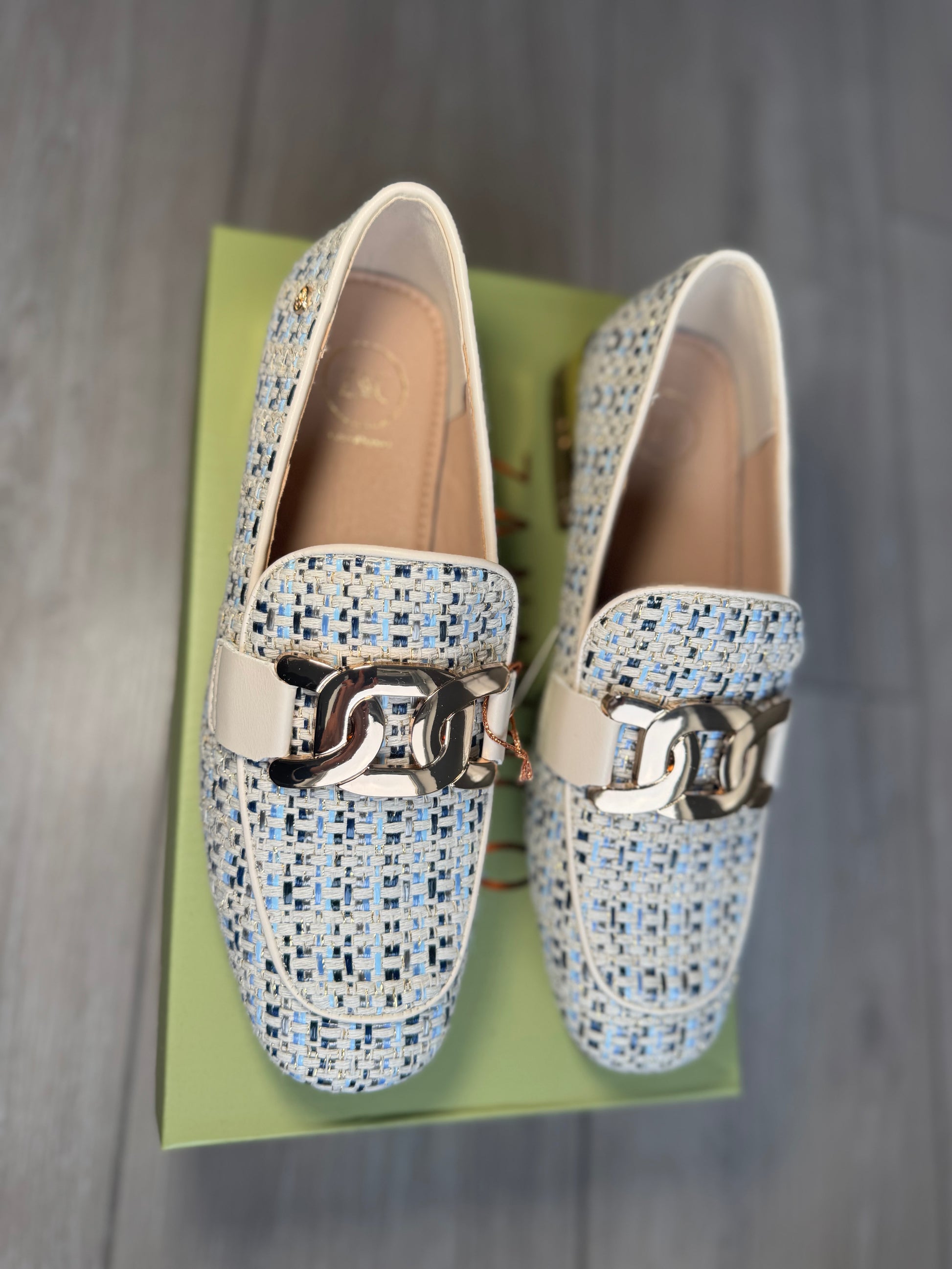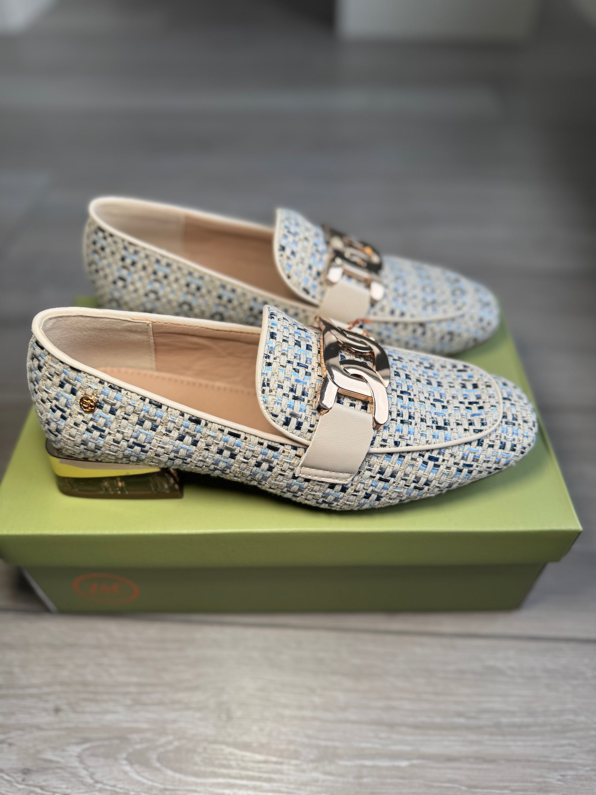 Zanni & Co Slip On Loafer with Square Toe, Gold Chain & Block Tortoiseshell Heel. Two Toned Tweed Finish