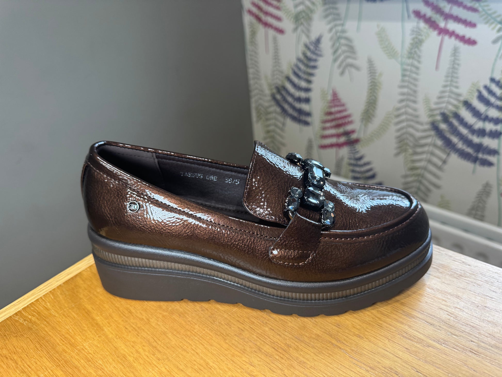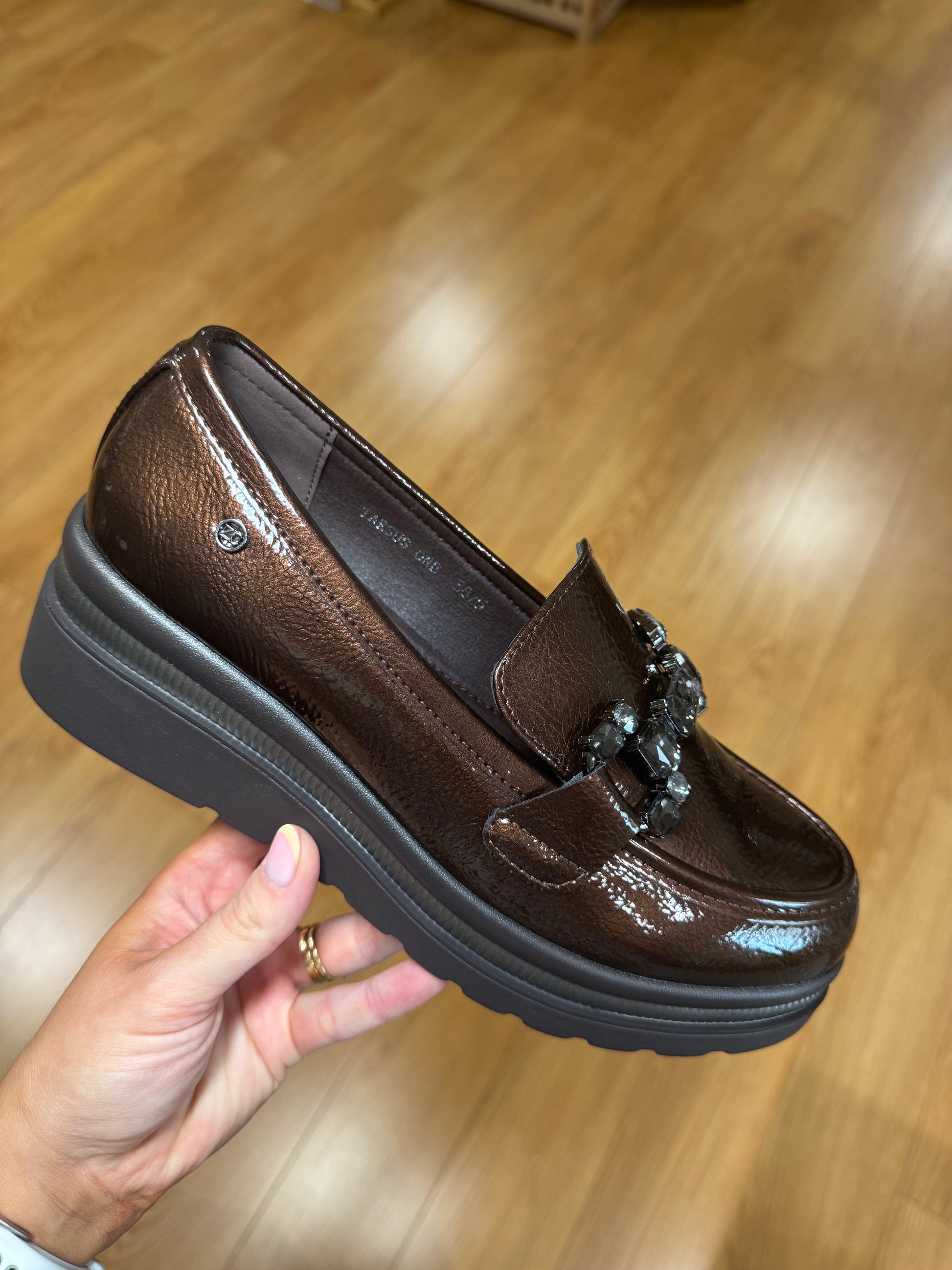 Zanni & Co Wedged/Platform Slip On Loafer with Metallic/Patent Shimmer & Diamanté Chain